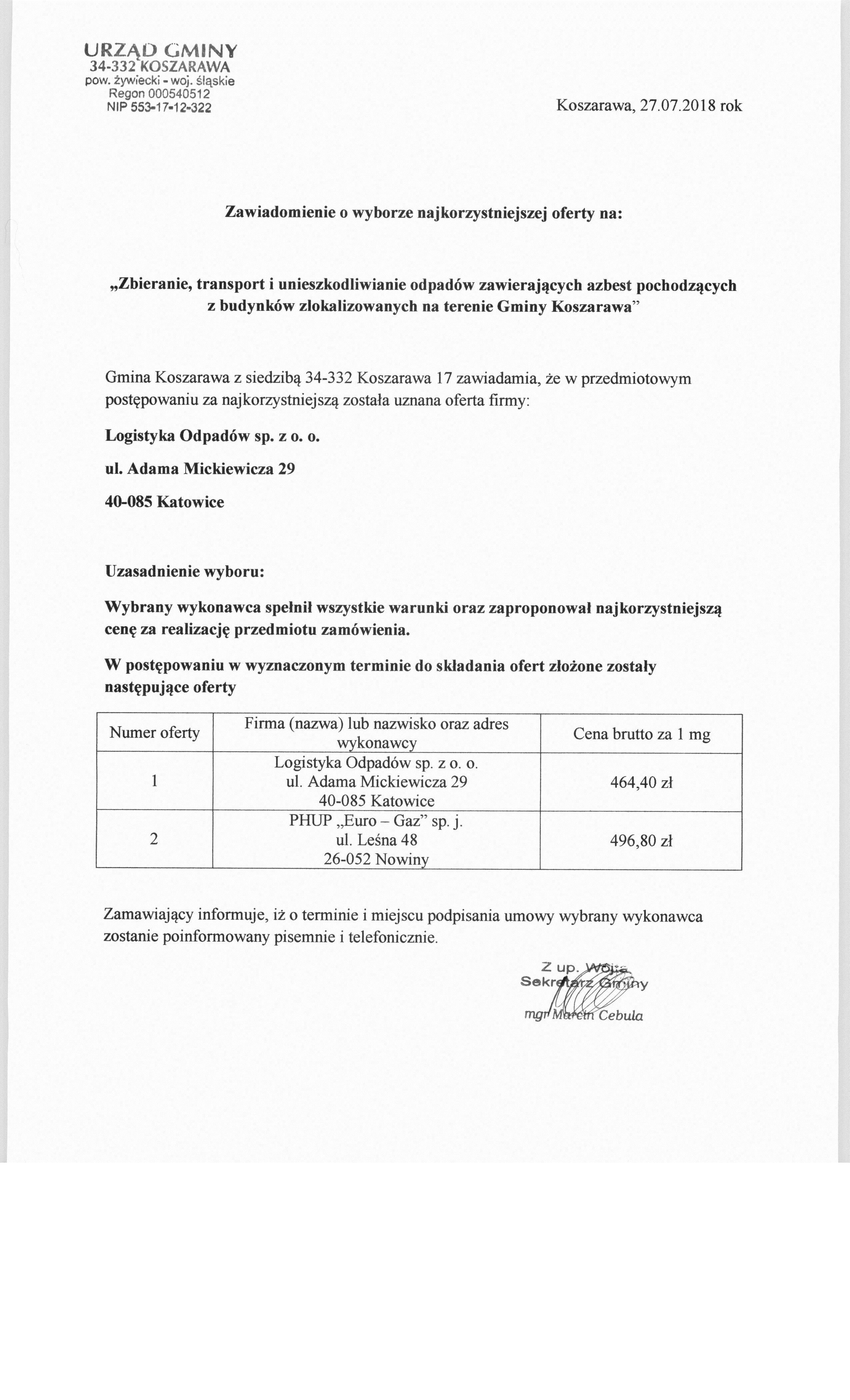 Zawiadomienie o wyborze oferty na: Udzielenie kredytu długoterminowego na finansowanie planowanego deficytu budżetu Gminy Koszarawa w 2017r.