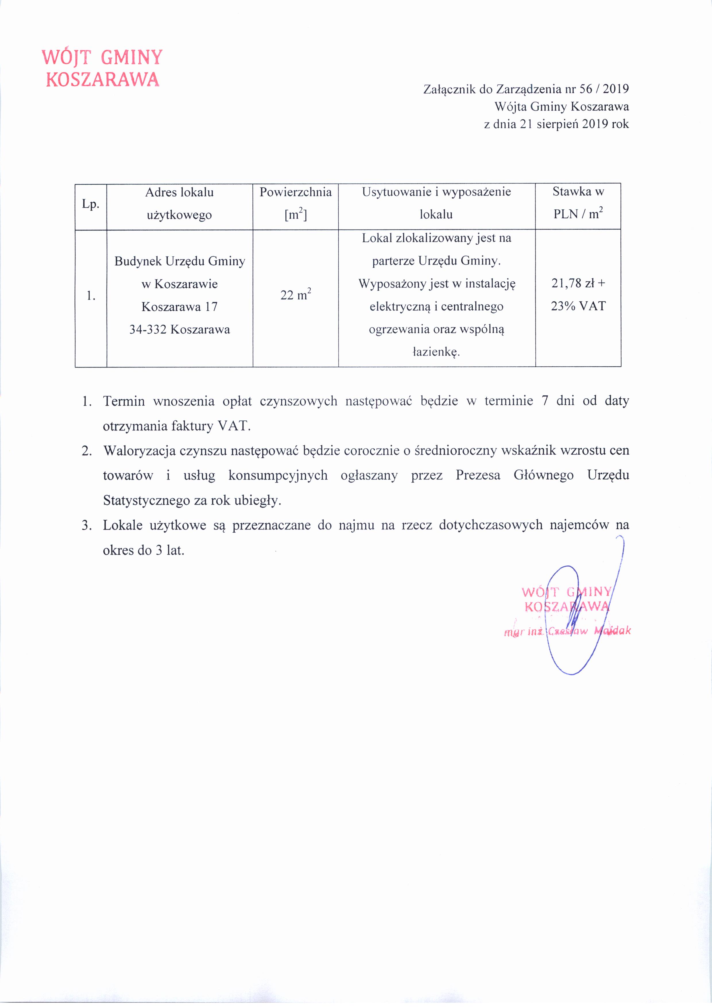 Załącznik nr 1 do Zarządzenia Wójta Gminy Koszarawa nr 52/18 z dnia 7 września 2018 r.