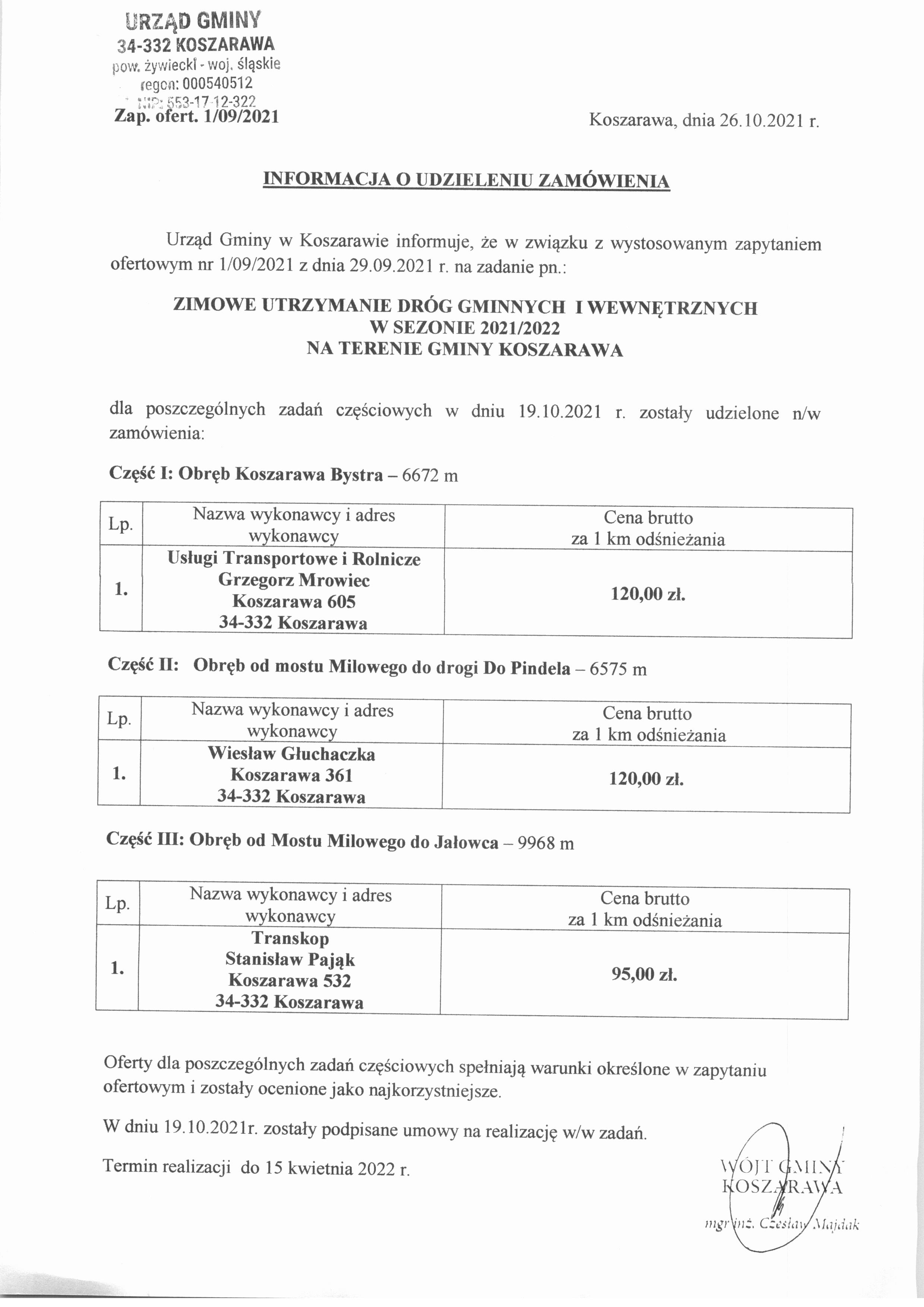 Zapytanie ofertowe nr 1/09/2021 na zadanie pn.: Zimowe utrzymanie dróg gminnych i wewnętrznych w sezonie 2021/2022 na terenie Gminy Koszarawa