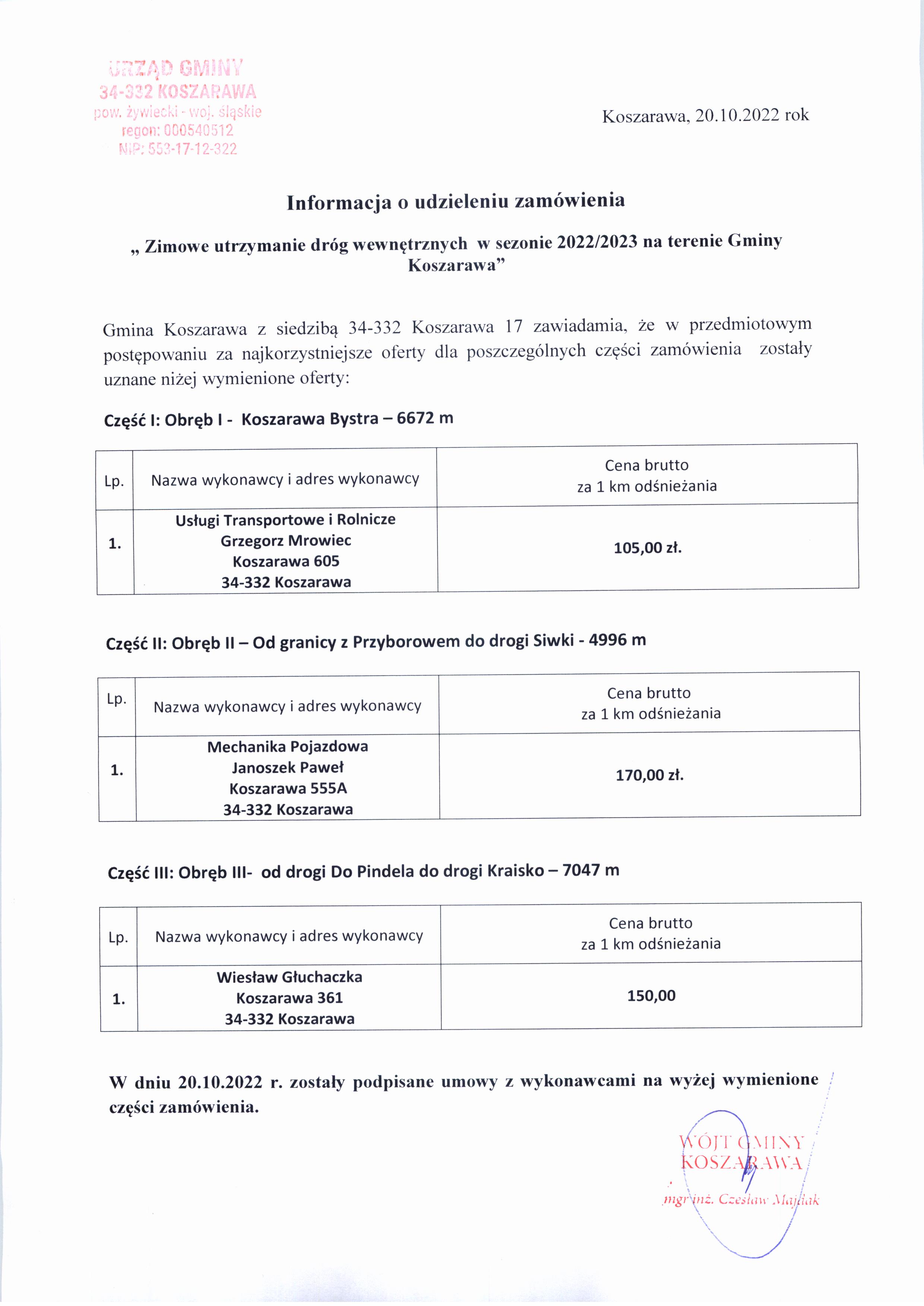 Zapytanie ofertowe na zimowe utrzymanie dróg wewnętrznych w sezonie 2022/2023 na terenie Gminy Koszarawa - cześć 2 i 3