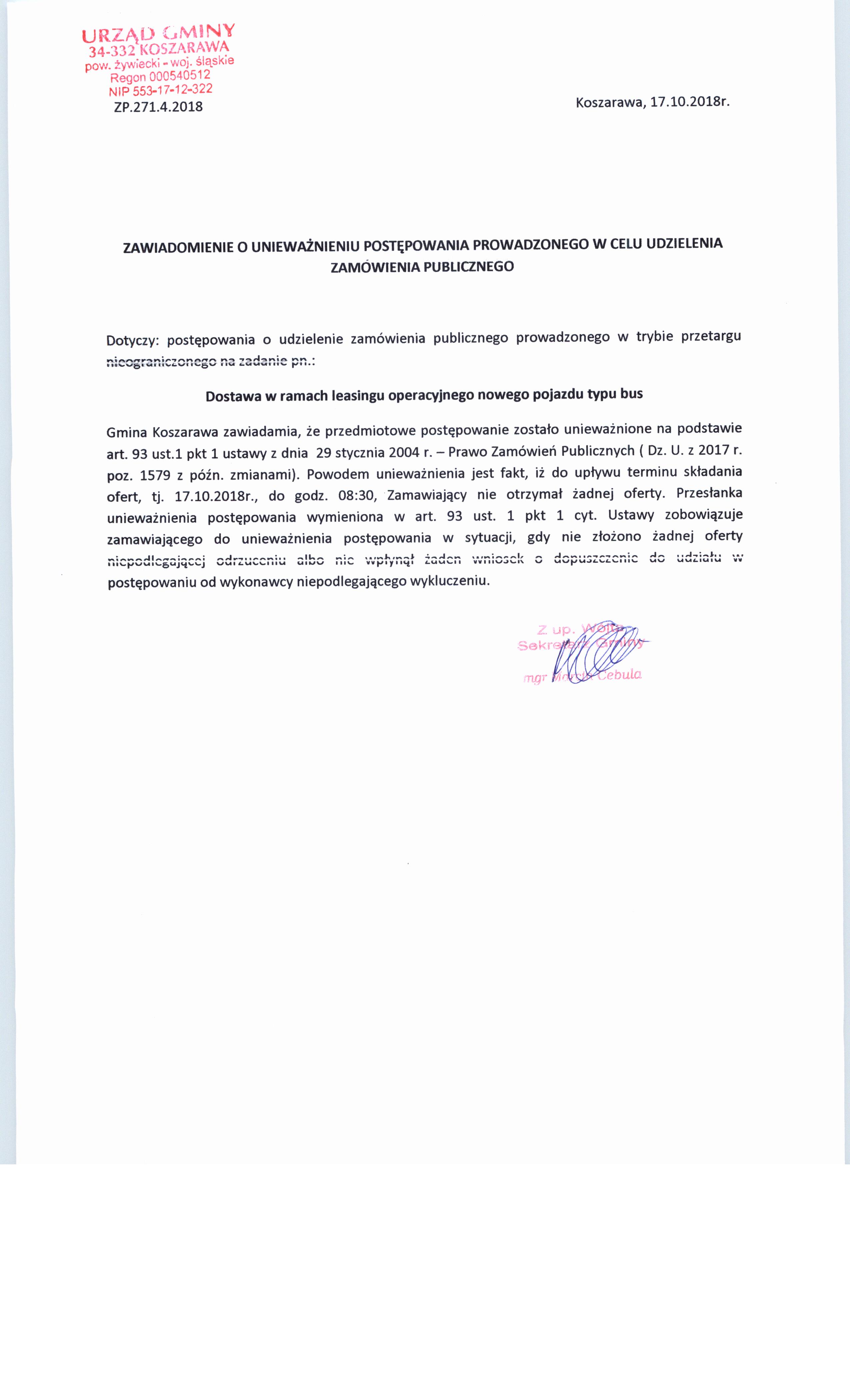 Zawiadomienie o unieważnieniu postępowania