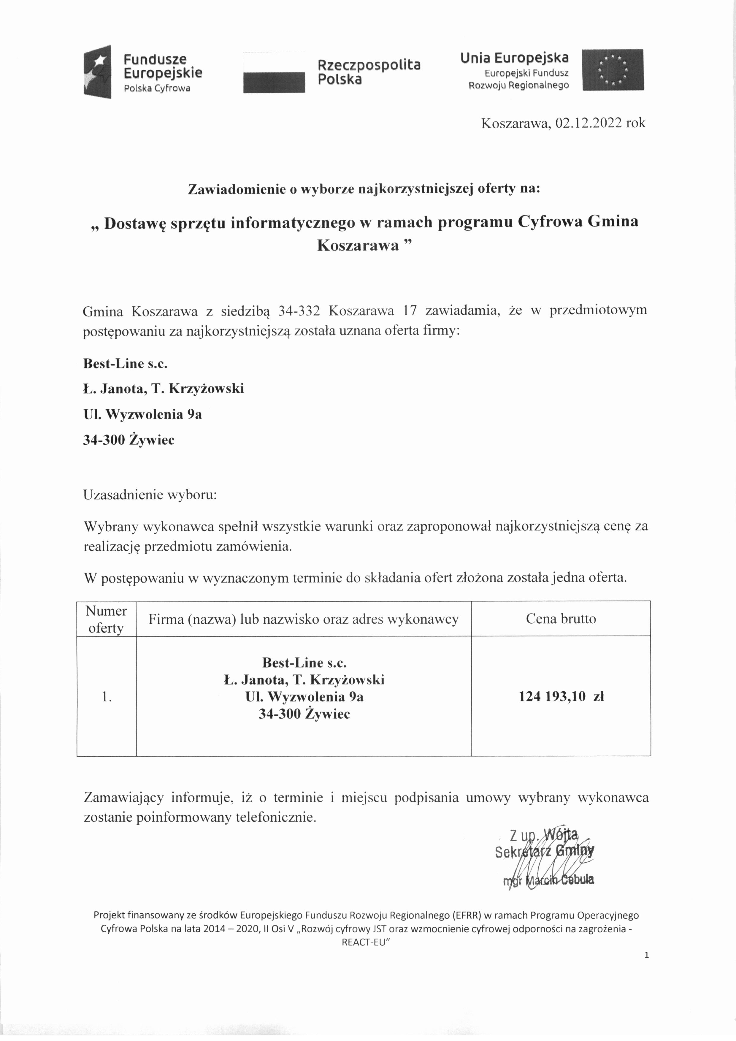 Zapytanie ofertowe na dostawę sprzętu informatycznego w ramach programu Cyfrowa Gmina Koszarawa