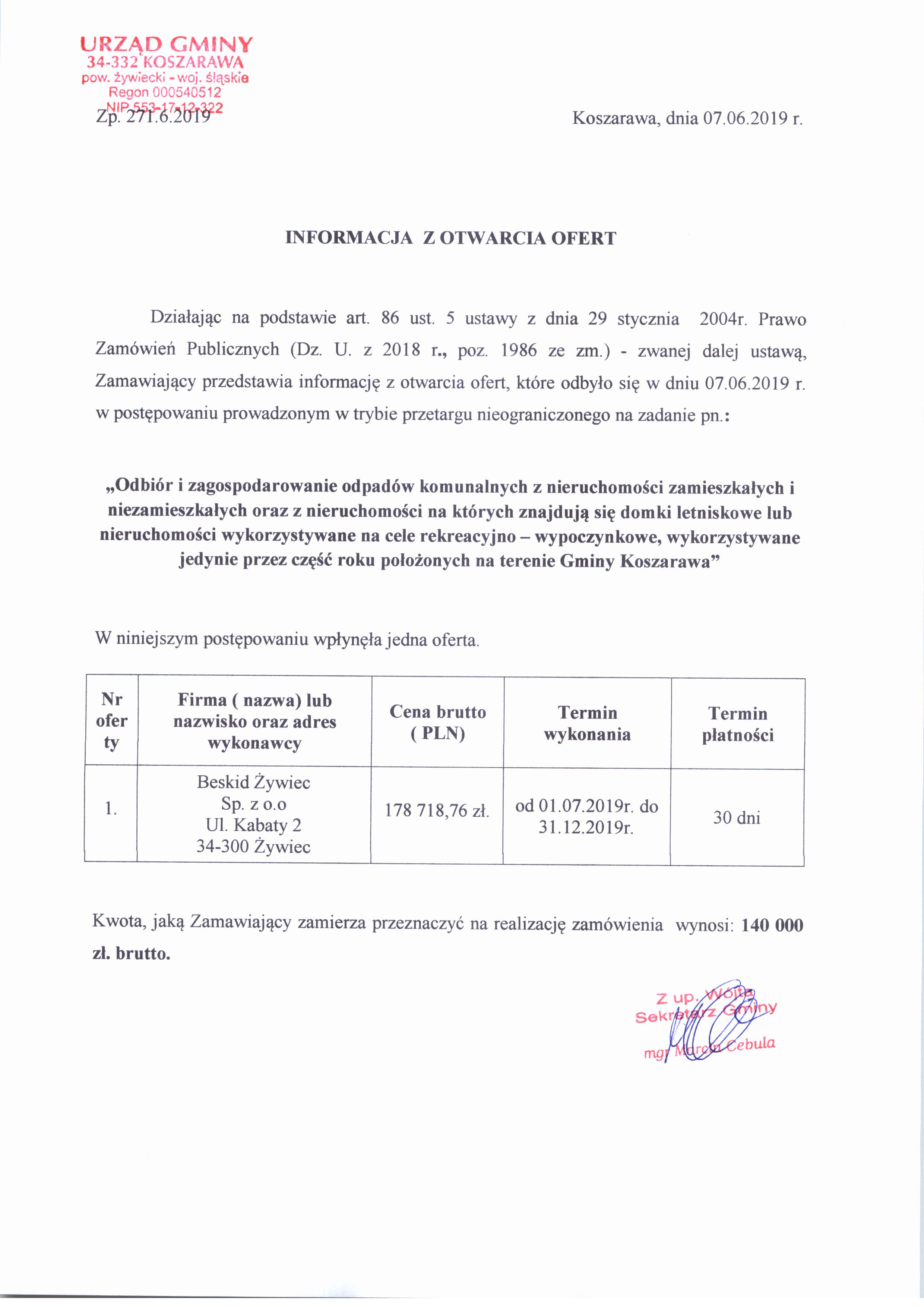 Urząd Gminy w Koszarawie ogłasza przetarg nieograniczony na zadanie pn.: Odbiór i zagospodarowanie odpadów komunalnych z nieruchomości zamieszkałych i niezamieszkałych oraz z nieruchomości na których znajdują się domki letniskowe lub nieruchomości wykorzystywane na cele rekreacyjno – wypoczynkowe, wykorzystywane jedynie przez część roku położonych na terenie Gminy Koszarawa