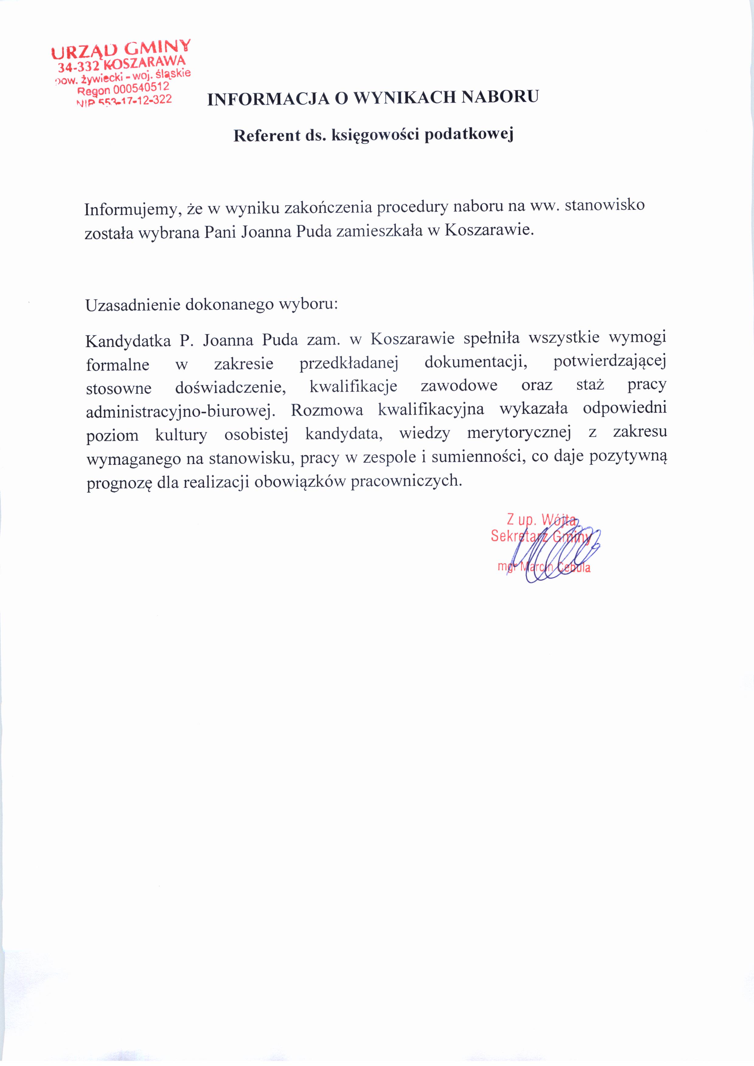 Ogłoszenie o naborze na wolne stanowisko urzędnicze z dnia 22 stycznia 2020 r.