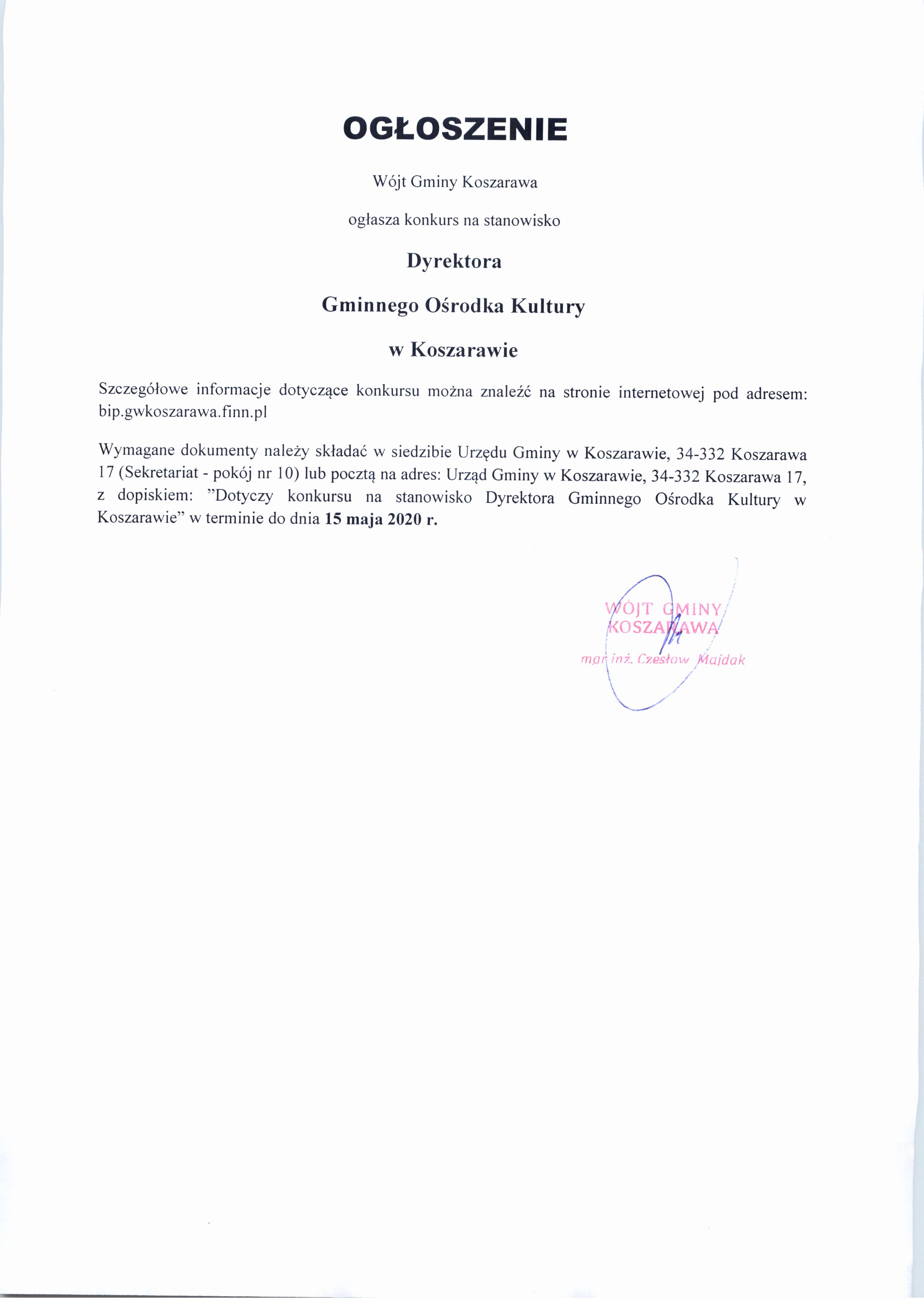 Ogłoszenie Wójta Gminy Koszarawa - konkurs na stanowisko Dyrektora Gminnego Ośrodka Kultury w Koszarawie