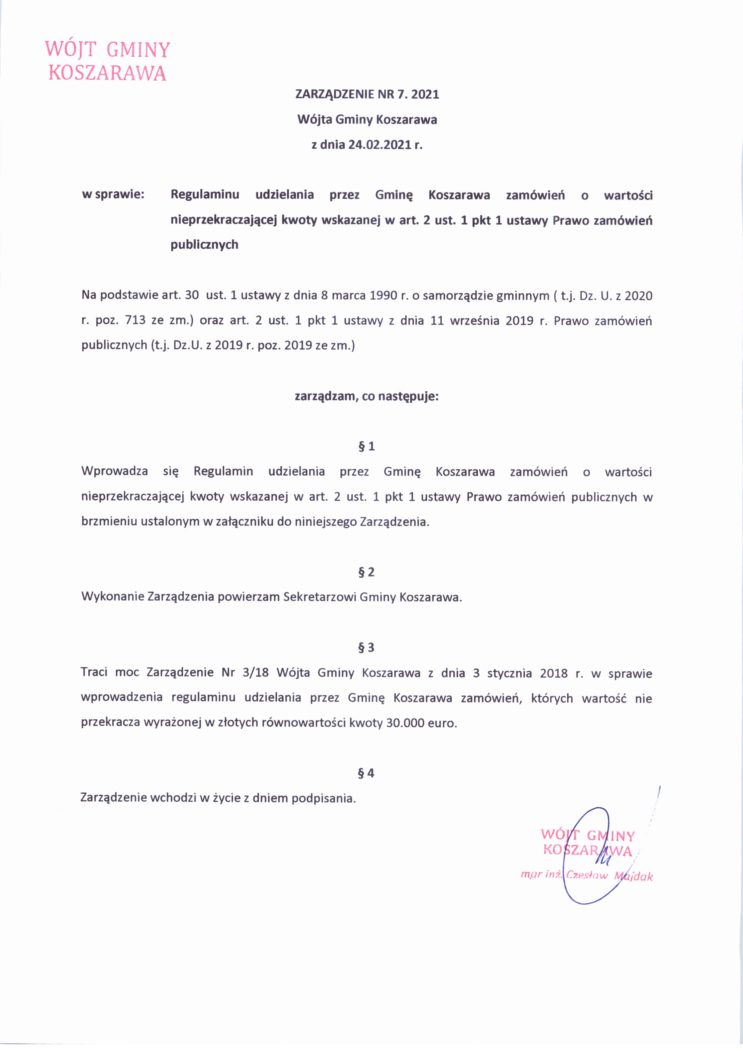 Zarządzenie Nr 7.2021 Wójta Gminy Koszarawa z dnia 24.02.2021r.