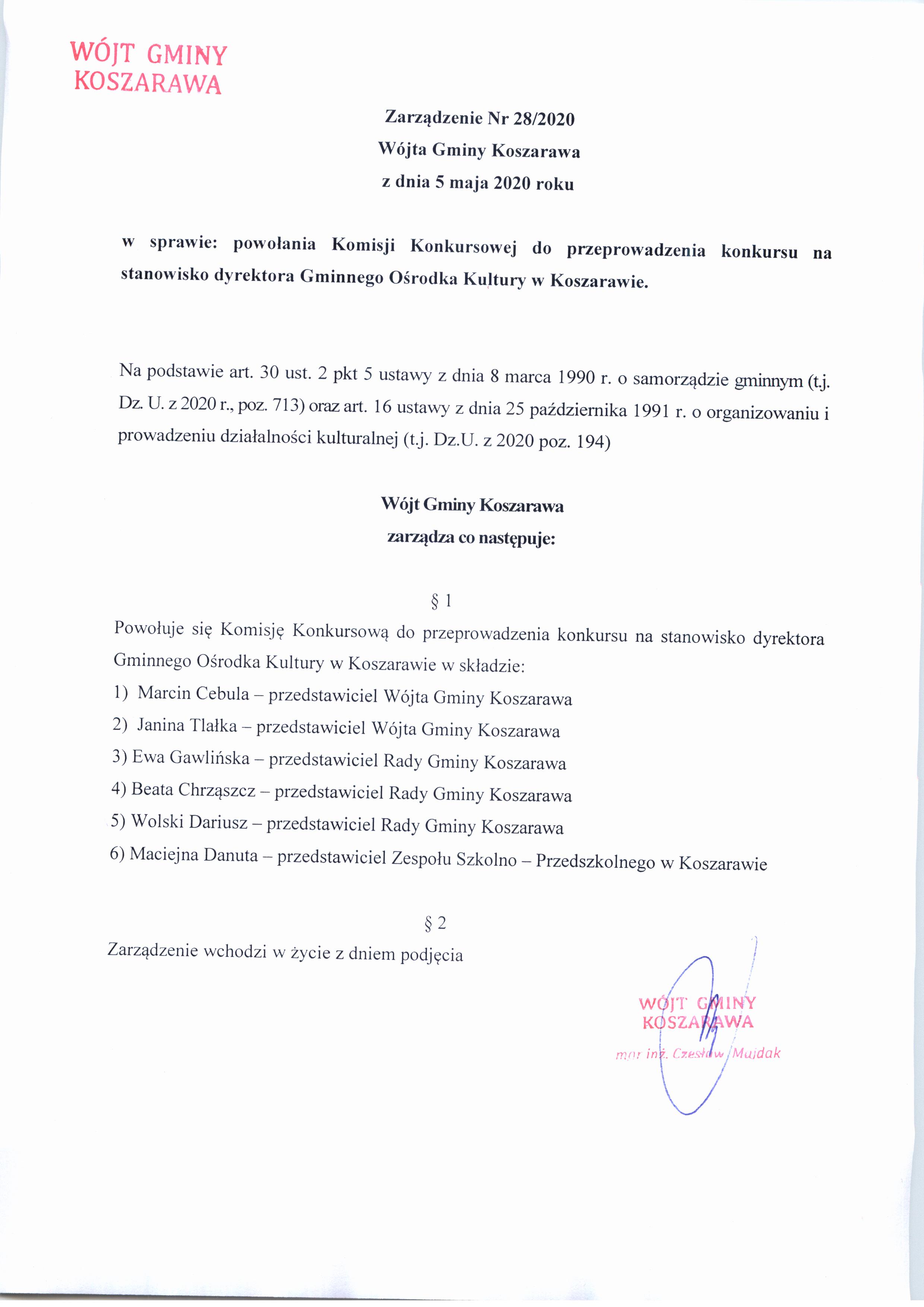 w sprawie: powołania Komisji Konkursowej do przeprowadzenia konkursu na stanowisko dyrektora Gminnego Ośrodka Kultury w Koszarawie