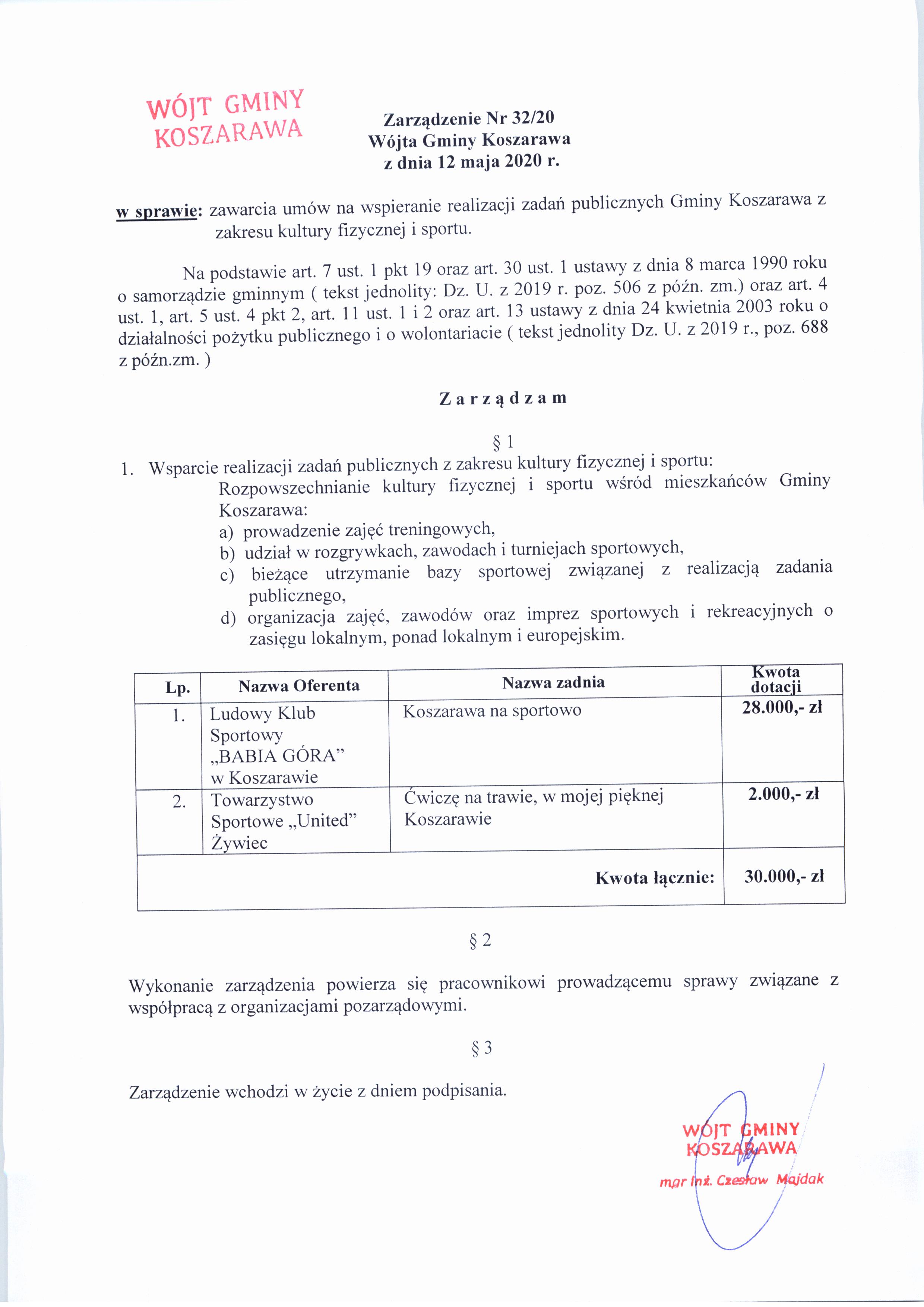 w sprawie: zawarcia umów na wspieranie realizacji zadań publicznych Gminy Koszarawa z zakresu kultury fizycznej i sportu