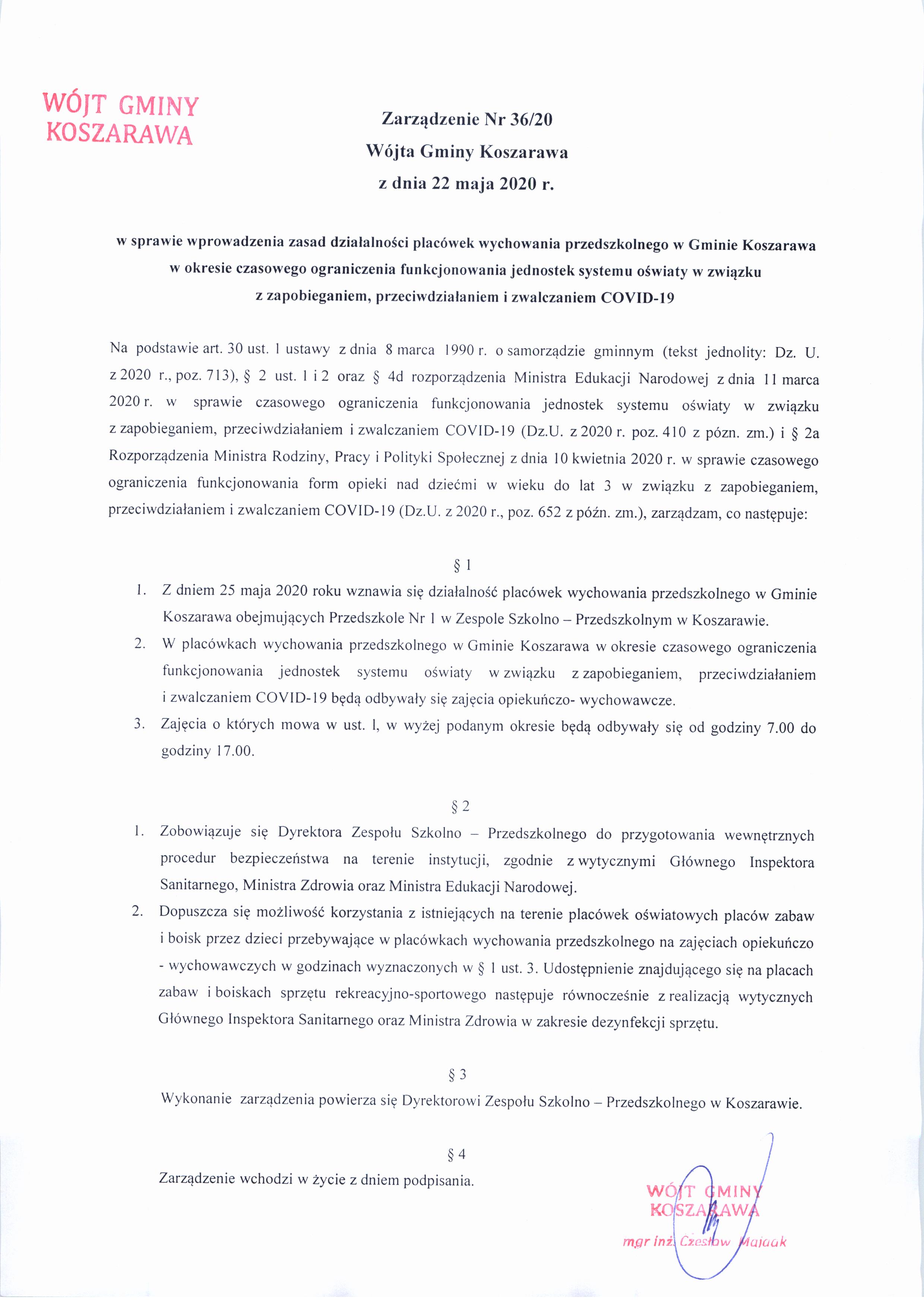 w sprawie: wprowadzenia zasad działalności placówek wychowania przedszkolnego w Gminie Koszarawa w okresie czasowego ograniczenia funkcjonowania jednostek systemu oświaty w zawiązku z zapobieganiem, przeciwdziałaniem i zwlaczaniem COVID - 19