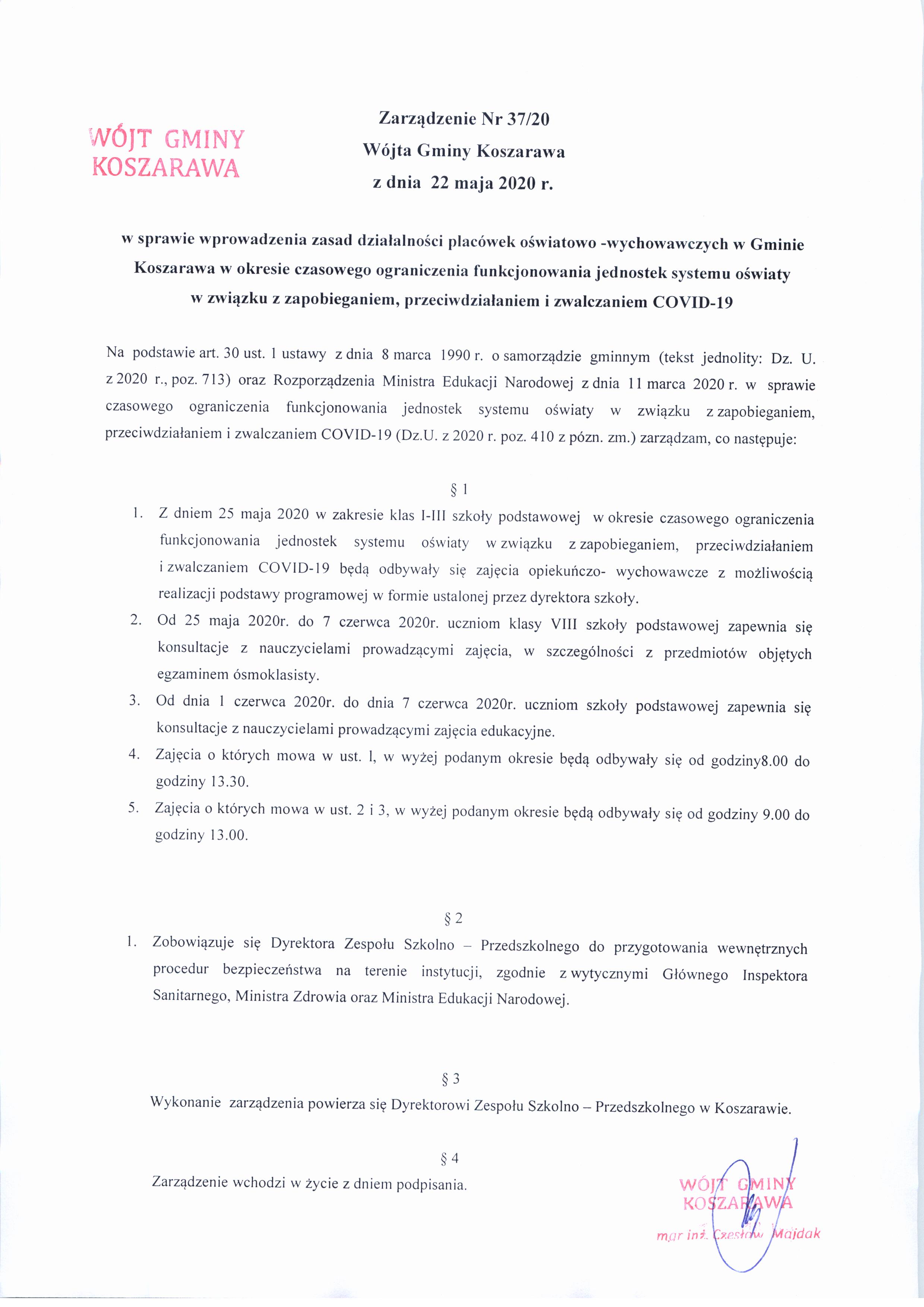 w sprawie: wprowadzenia zasad działalności placówek oświatowo - wychowawczych w Gminie Koszarawa w okresie czasowego ograniczenia funkcjonowania jednostek systemu oświaty w związku z zapobieganiem, przeciwdziałaniem i zwalczaniem COVID-19