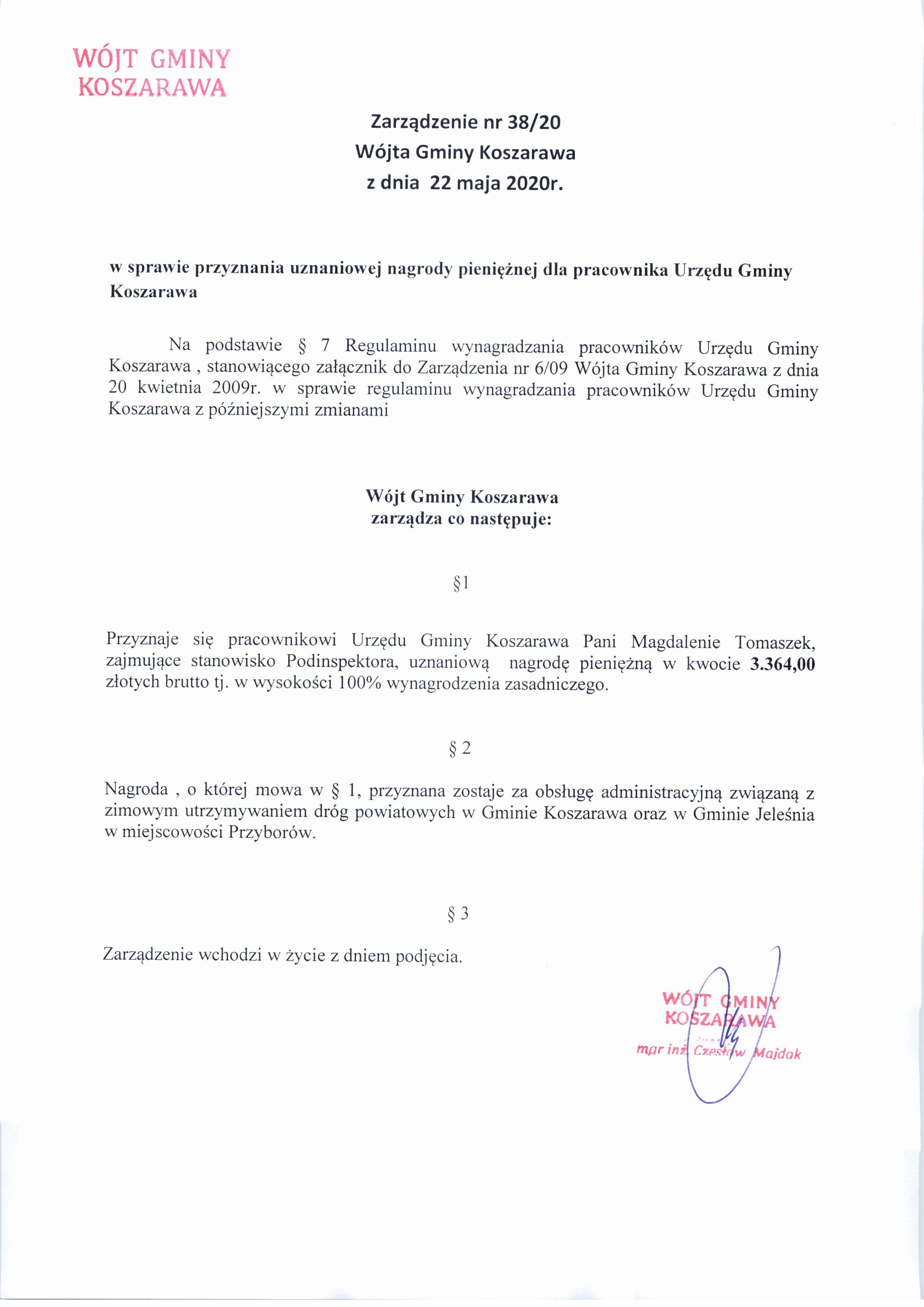 w sprawie przyznania uznaniowej nagrody pieniężnej dla pracownika Urzędu Gminy Koszarawa
