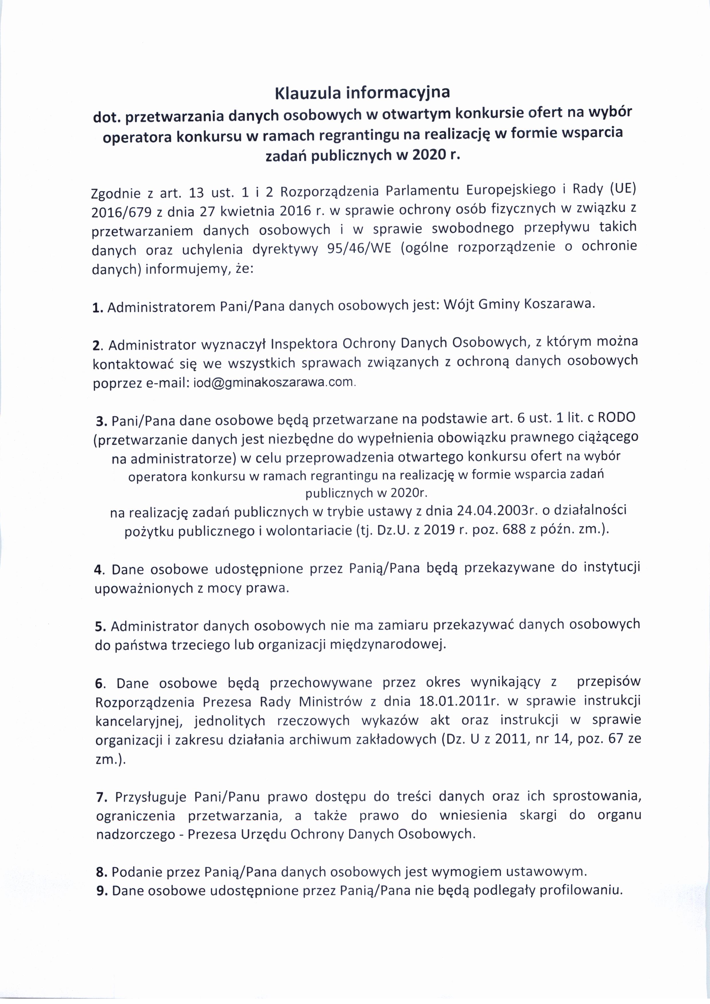 dot. przetwarzania danych osobowych w otwartym konkursie ofert na wybór operatora konkursu w ramach regrantingu na realizację w formie wsparcia zadań publicznych w 2020 r.