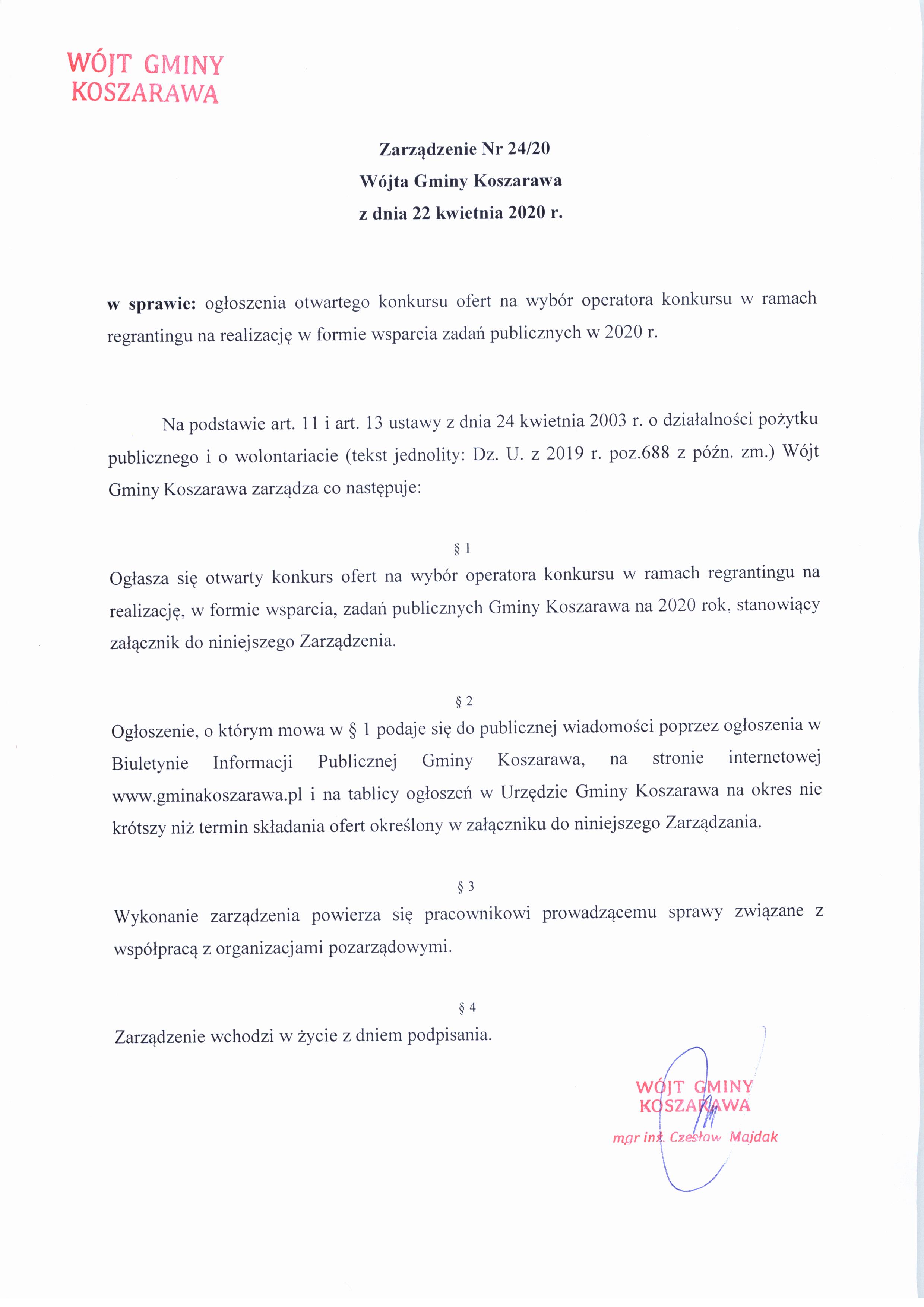 Zarządzenie Nr 24/20 Wójta Gminy Koszarawa z dnia 22 kwietnia 2020 r.