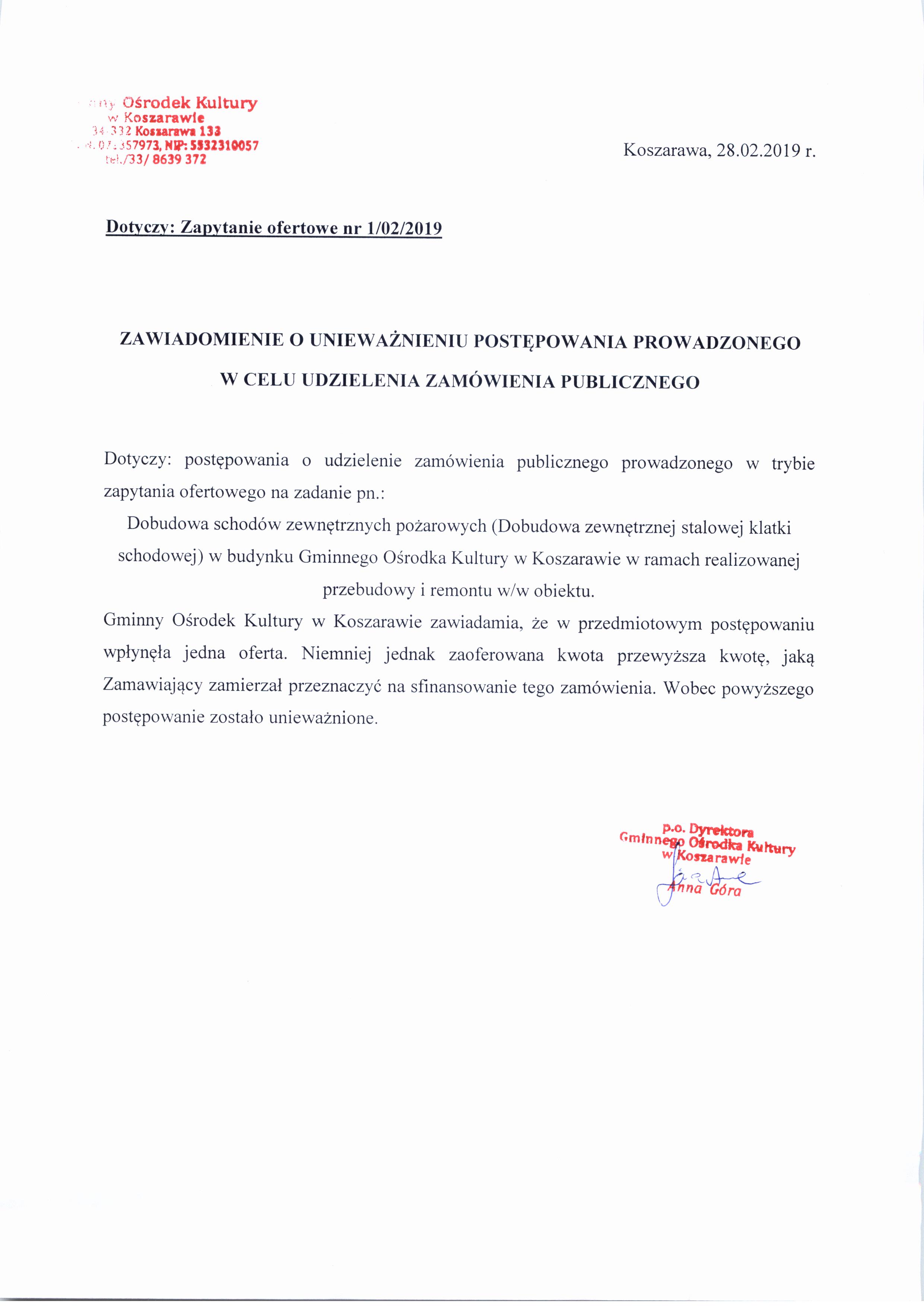 Gminny Ośrodek Kultury zaprasza do składania ofert na wykonanie robót budowlanych w zakresie dobudowy schodów zewnętrznych pożarowych.