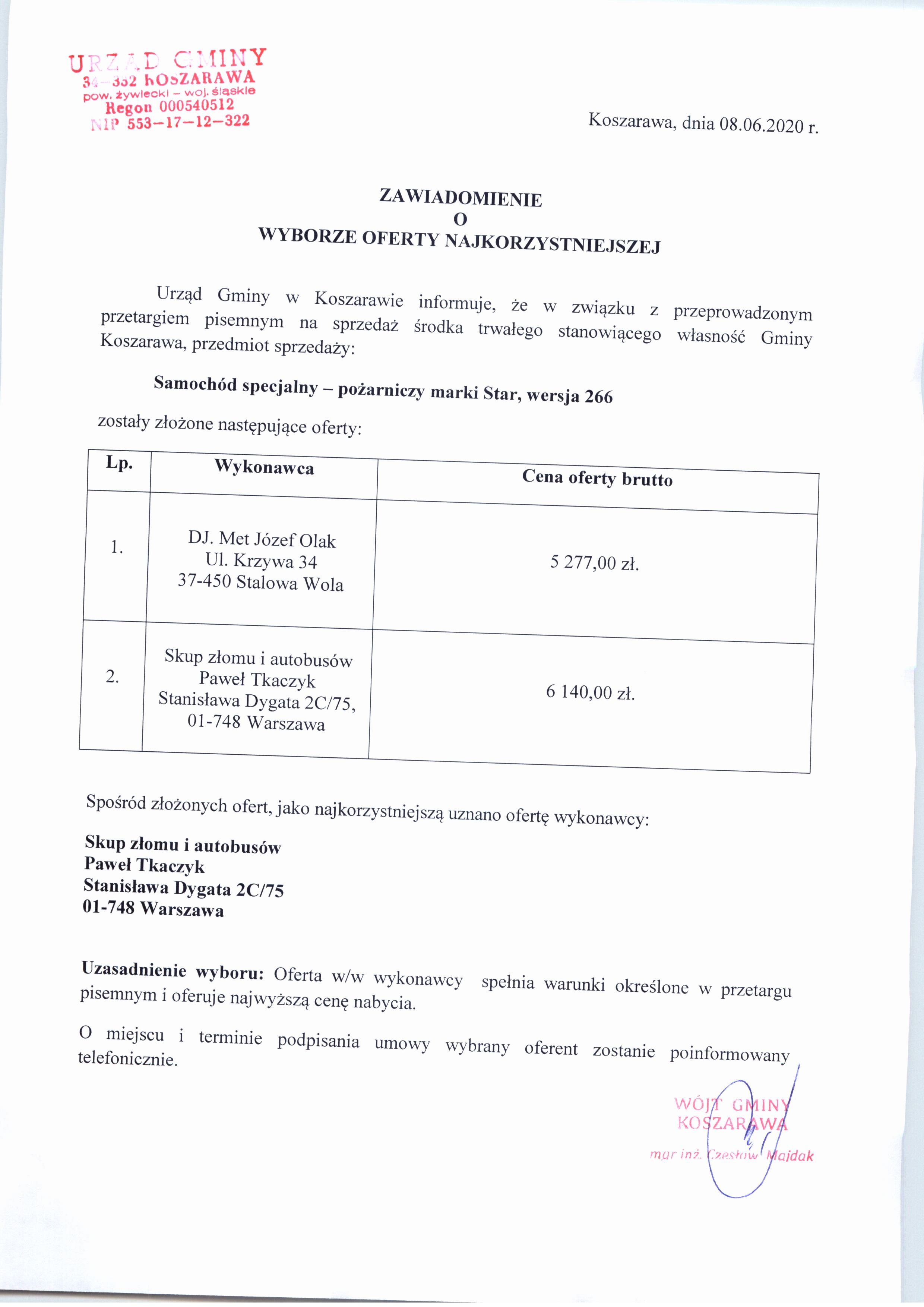 Ogłoszenie o przetargu pisemnym na sprzedaż środka trwałego