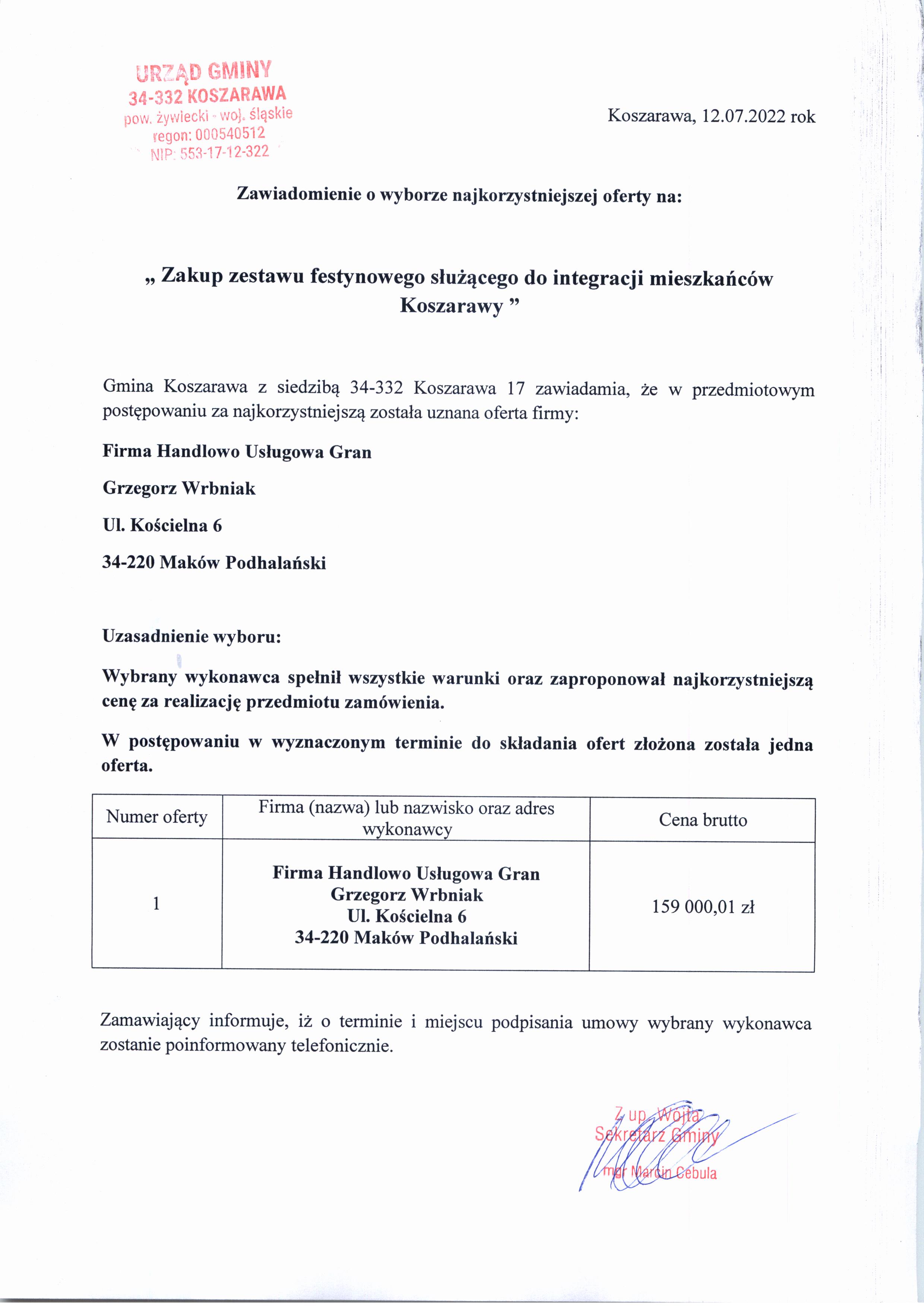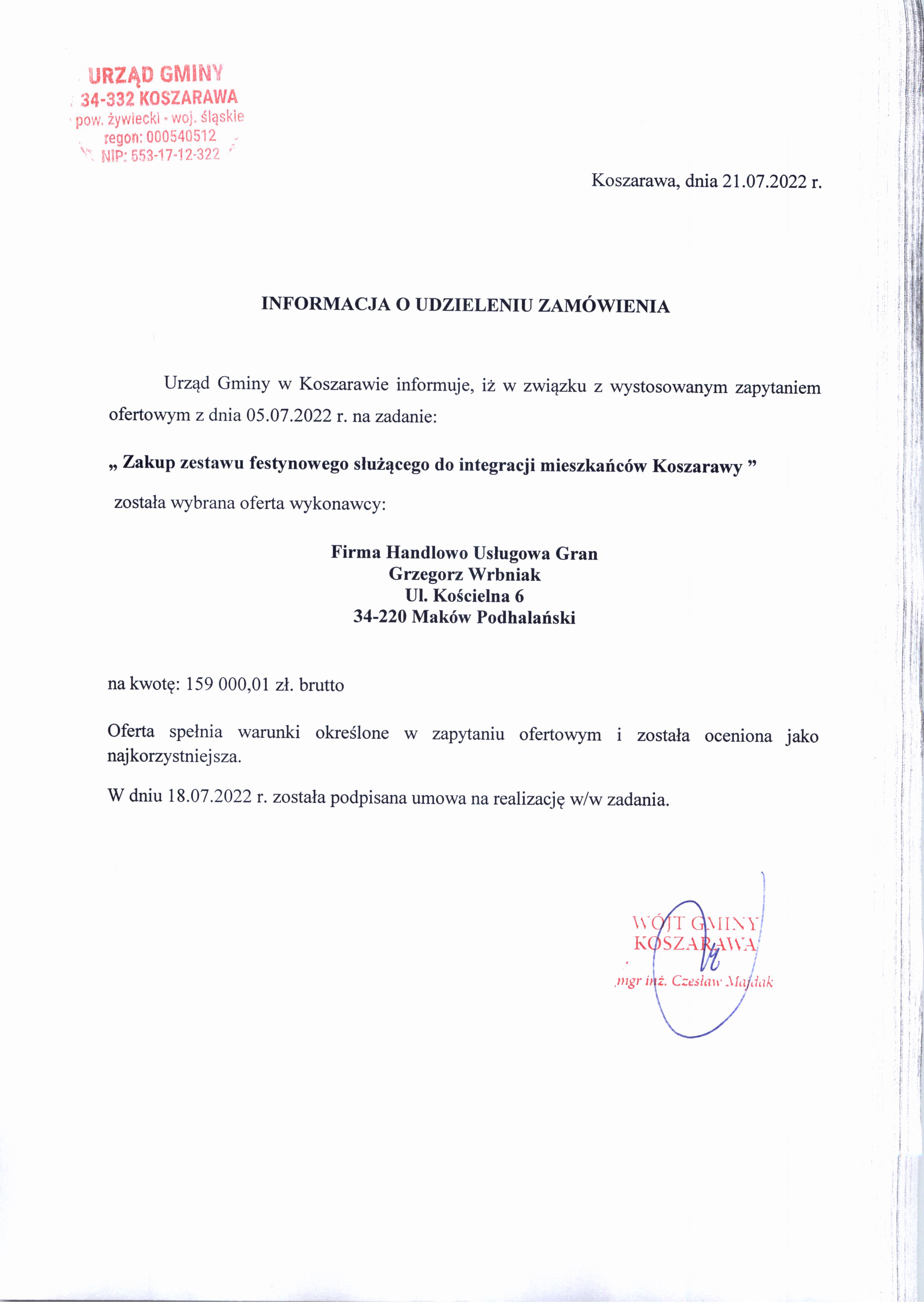 Zapytanie ofertowe na zadanie pn.: Zakup zestawu festynowego służącego do integracji mieszkańców Koszarawy .