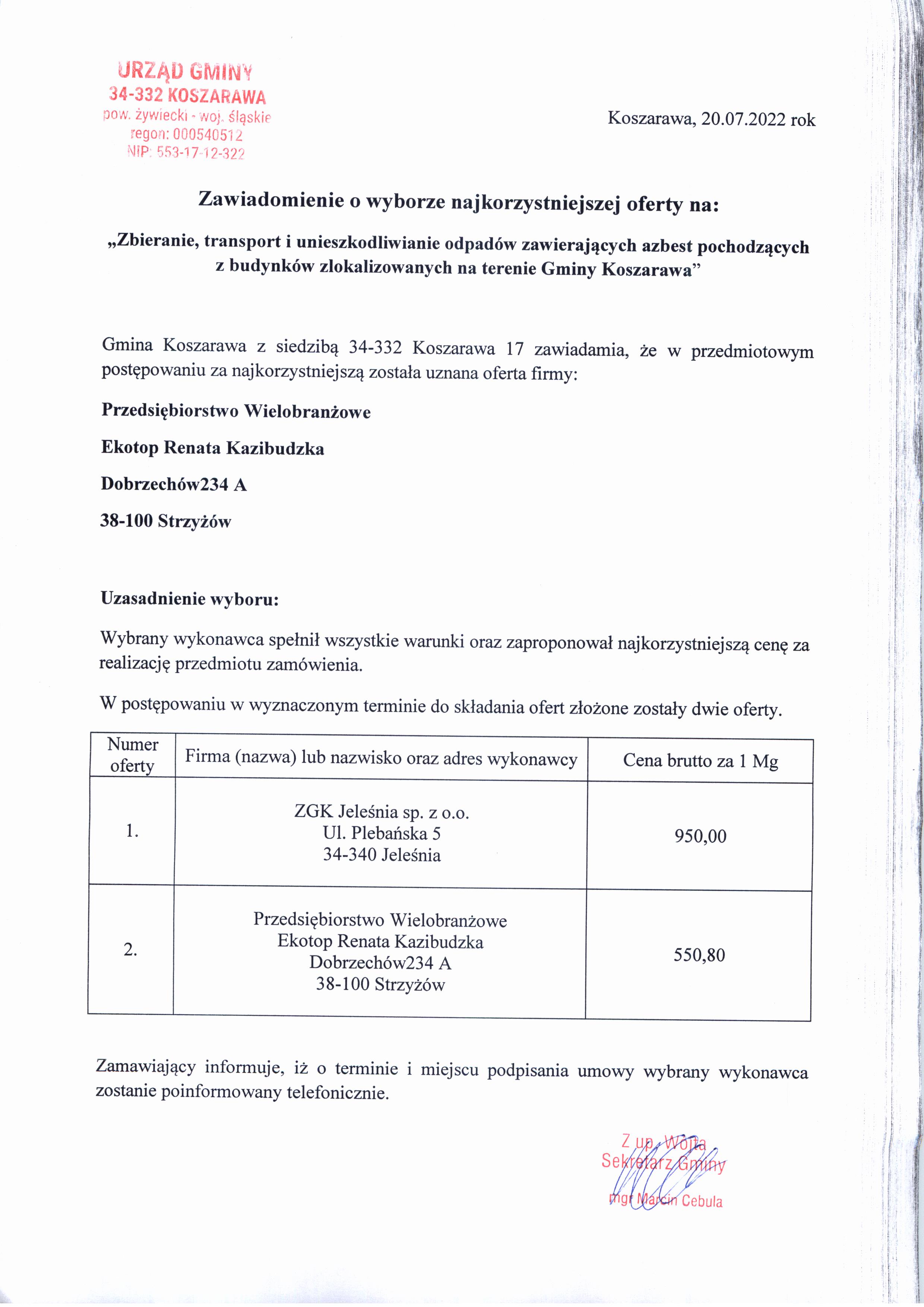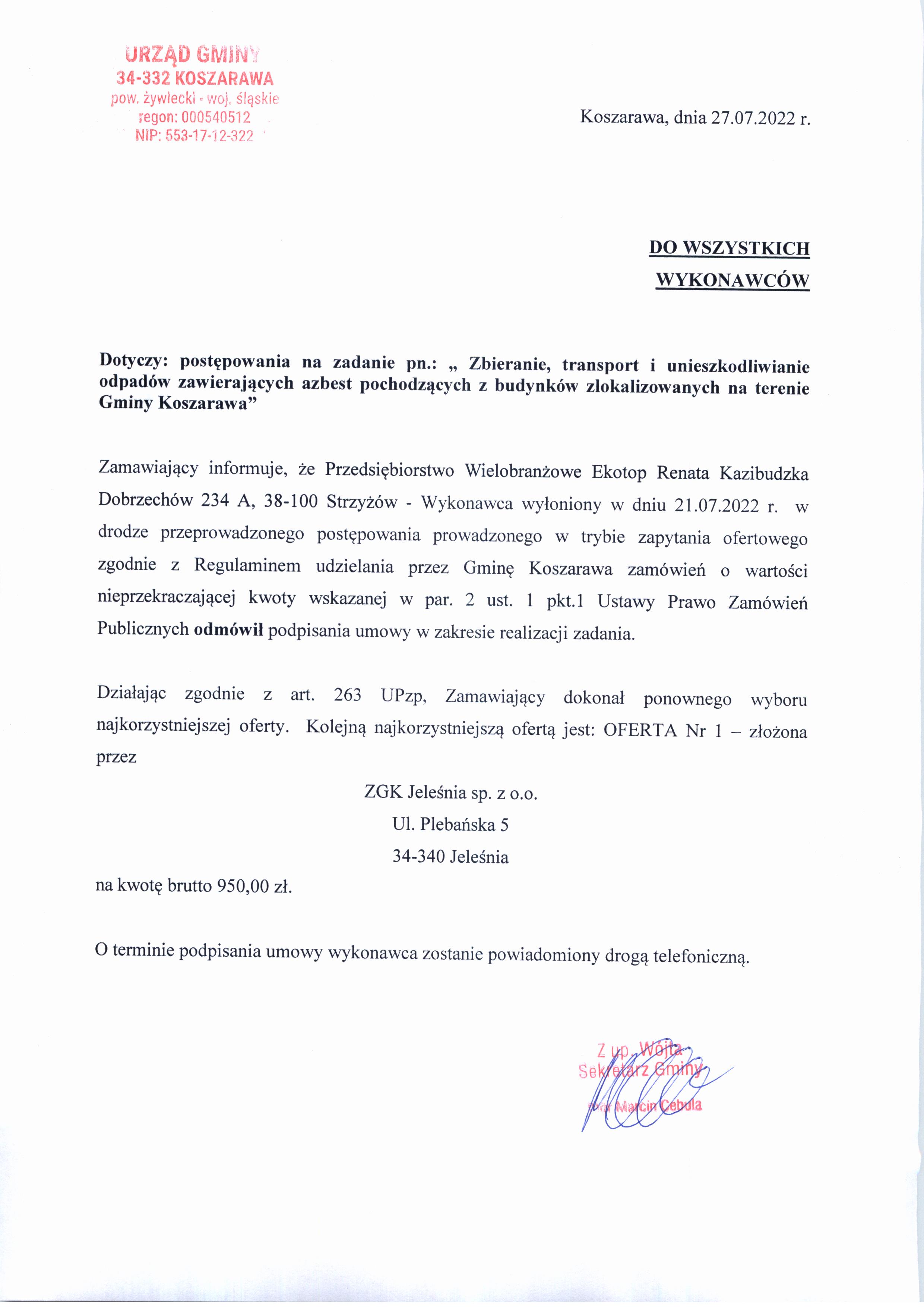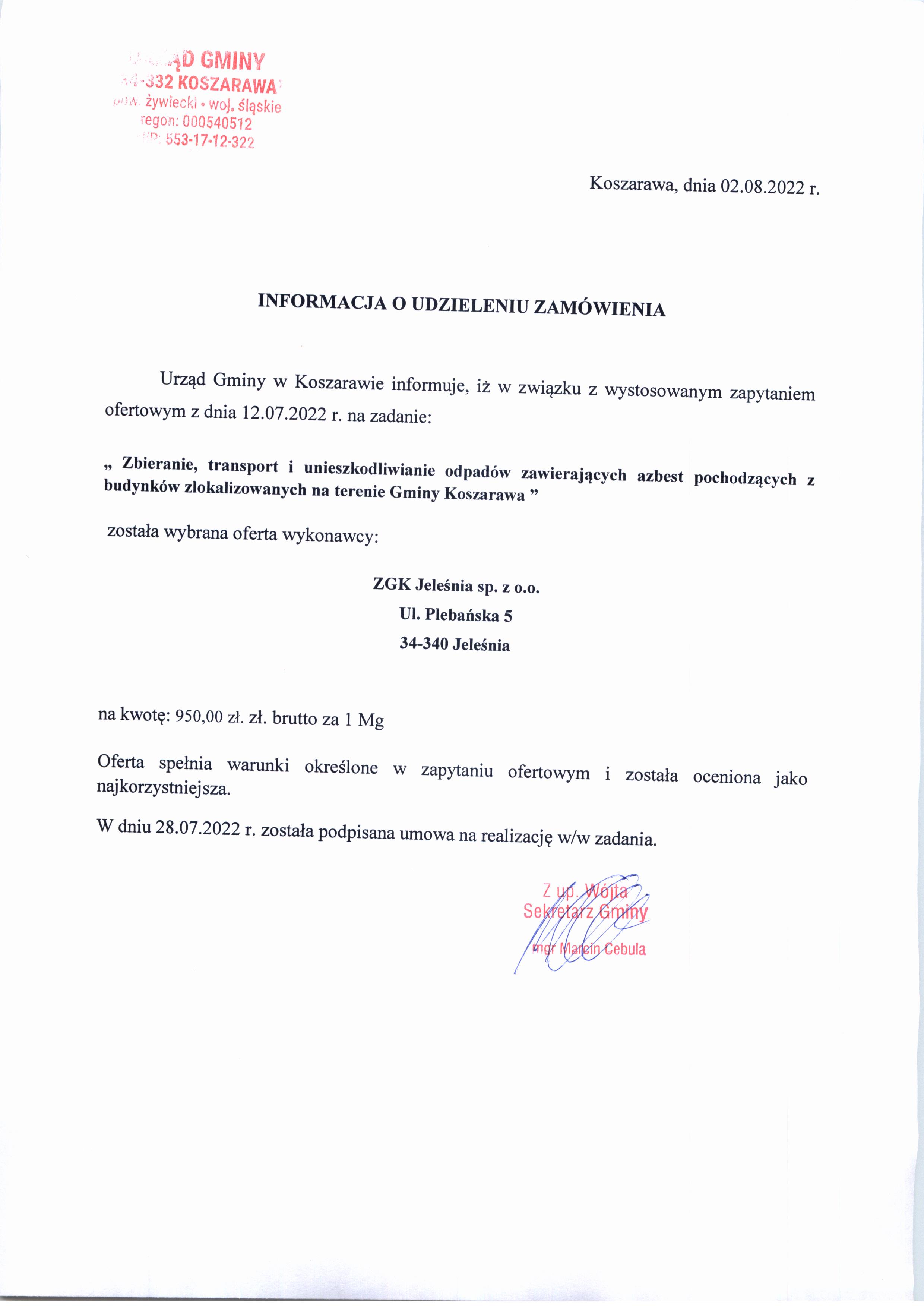 Zapytanie ofertowe na: „ Zbieranie, transport i unieszkodliwianie odpadów zawierających azbest pochodzących z budynków zlokalizowanych na terenie Gminy Koszarawa”
