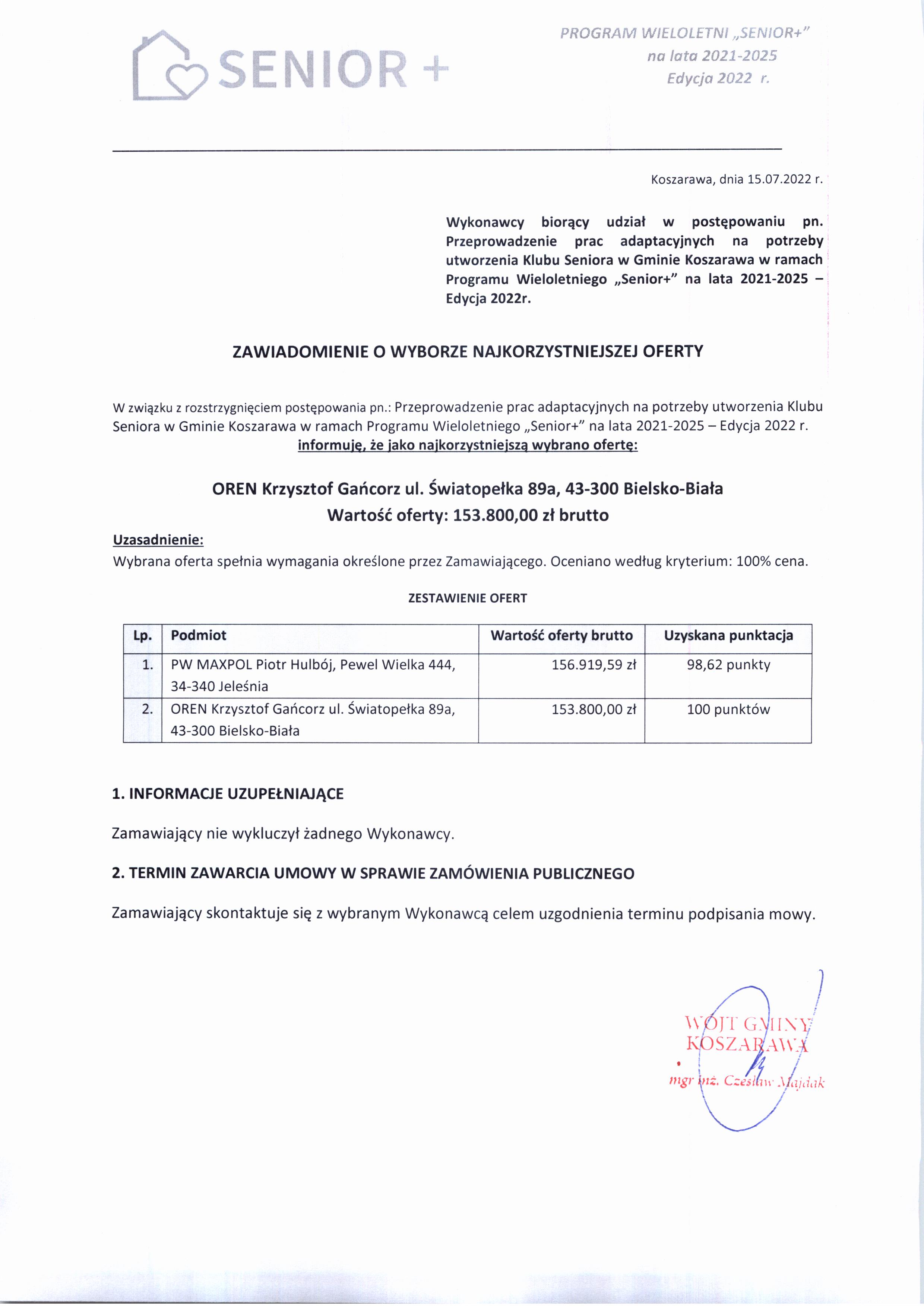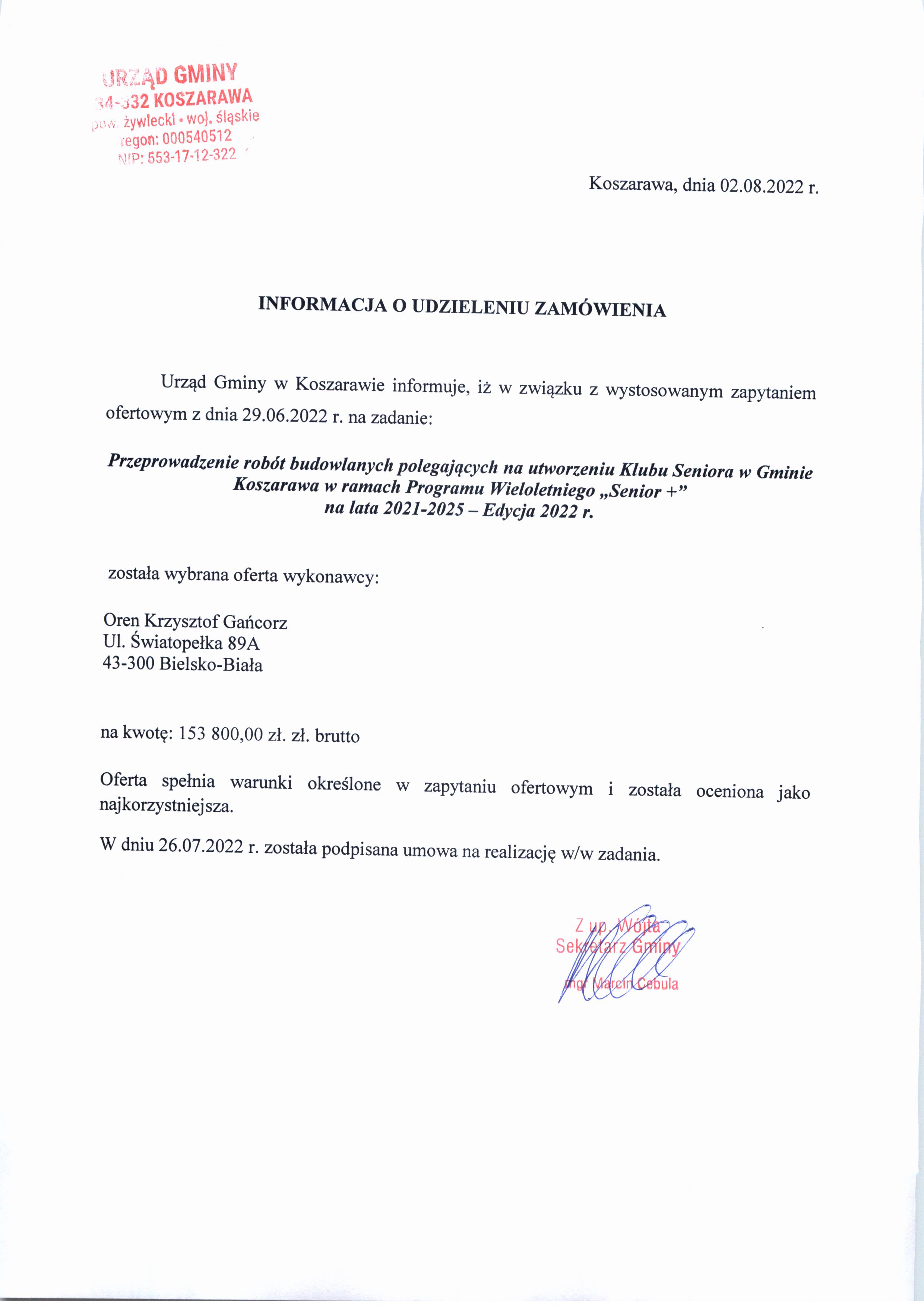 Zapytanie ofertowe na zadanie pn.: Przeprowadzenie robót budowlanych polegających na utworzeniu Klubu Seniora w Gminie Koszarawa w ramach Programu Wieloletniego „ Senior +” na lata 2021-2025 – Edycja 2022 r.